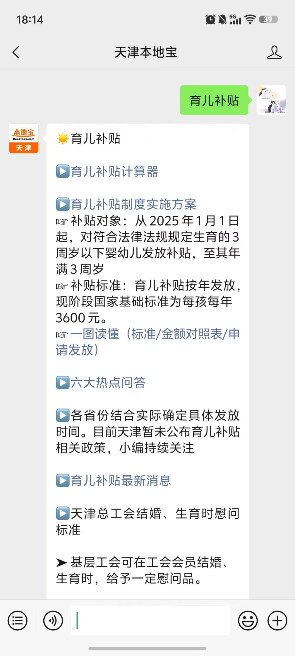 温馨提示:微信搜索公众号天津本地宝,关注后在对话框回复【育儿补贴】可获天津育儿补贴制度实施方案(补贴对象/金额/申领程序)及育儿补贴计算器等内容,天津详细政策持续关注更新。
